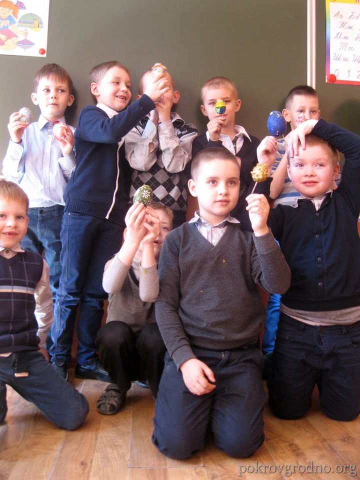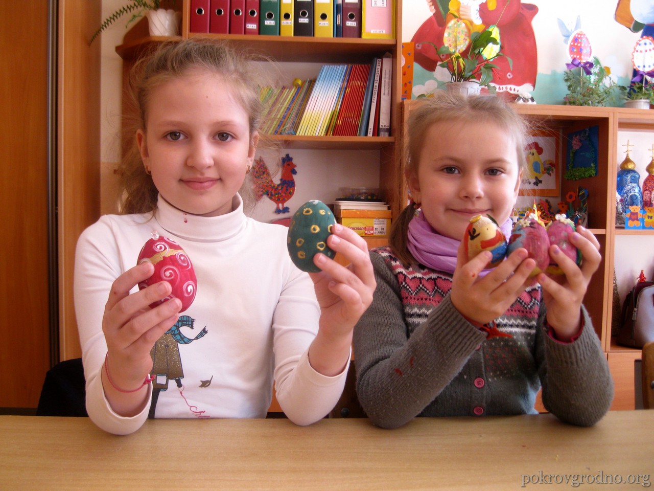 7 апреля 2017 года директор иконописной студии "Покров" при кафедральном соборе города Гродно Дарья Калиберда провела для учеников одного из первых классов ГУО "Средняя школа №15 имени Д.М.Карбышева г. Гродно" художественное занятие по оформлению писанок.