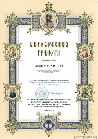 28 студзеня 2020 года ў Маскве, у Савеце Федэрацыі прайшло ўзнагароджанне пераможцаў Усерасійскага конкурсу “За маральны подзвіг настаўніка” і пераможцаў Міжнароднага конкурсу “Прыгажосць Божага свету”. Узнагароджвалі прызёраў конкурсу Свяцейшы Патрыярх Маскоўскі і ўсяе Русі Кірыл і старшыня Савета Федэрацыі Валянціна Матвіенка. Узнагароджанне прайшло ў межах VIII Калядных Парламенцкіх сустрэч. У намінацыі “Праваслаўная ікона” узнагароду за першае месца ва ўзроставай групе з 13 да 17 год атрымала Аліна Мусатава (16 год), праца – “Багалюбская ікона Маці Божай”, горад Гродна Рэспублікі Беларусь. Пра ўдзел у конкурсе мы пісалі раней: 1-е месца іканапіснай студыі “Пакроў” на міжнародным конкурсе “Прыгажосць Божага свету”.
