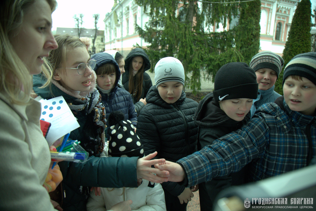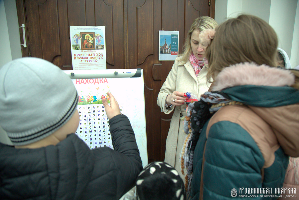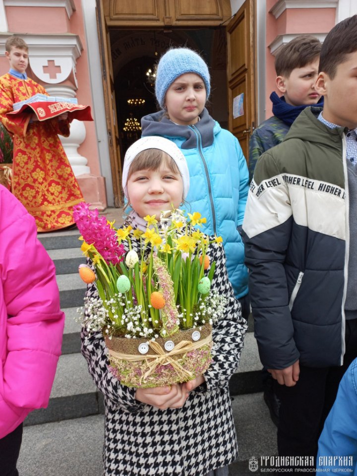 В светлый день Пасхи на праздник были приглашены воспитанники Воскресной школы вместе с родителями и педагогами, участники семейного клуба, семьи с инвалидами при Гродненском Благотворительном Обществе. Всех вместе собрала Божественная Литургия, чтобы в молитве прославить Воскресшего Господа Иисуса Христа. В завершении Литургии духовник Воскресной школы отец Владимир Борисевич торжественно поздравил собравшихся с праздником и освятил пасхальные куличи и яйца. Особой благодатью и радостью в этот день был наполнен храм. На возглас священника «Христос воскресе!» все дружно отвечали - «Воистину воскресе»!