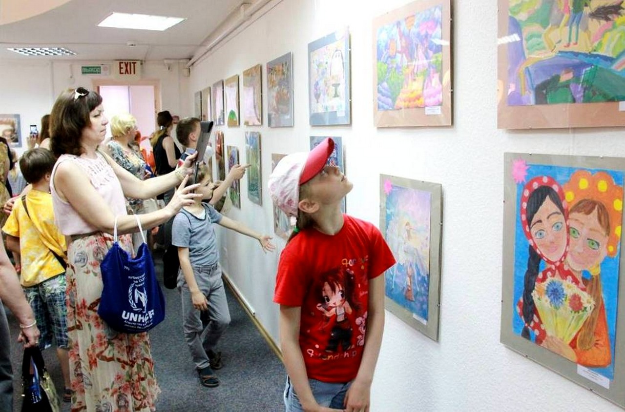 Выставка открылась в День защиты детей у арт-галереи "Высокае месца" в городе Минске и собрала гостей и участников конкурса для награждения юных художников, в творчестве которых нашлось место для сюжетов о беженцах.