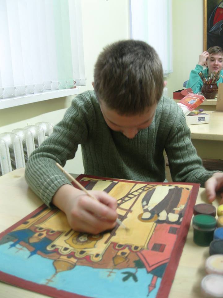 - Гуашь "Андрей Рублев расписывает Спасский собор Андроникова монастыря". Родион Алексей, 9 лет.