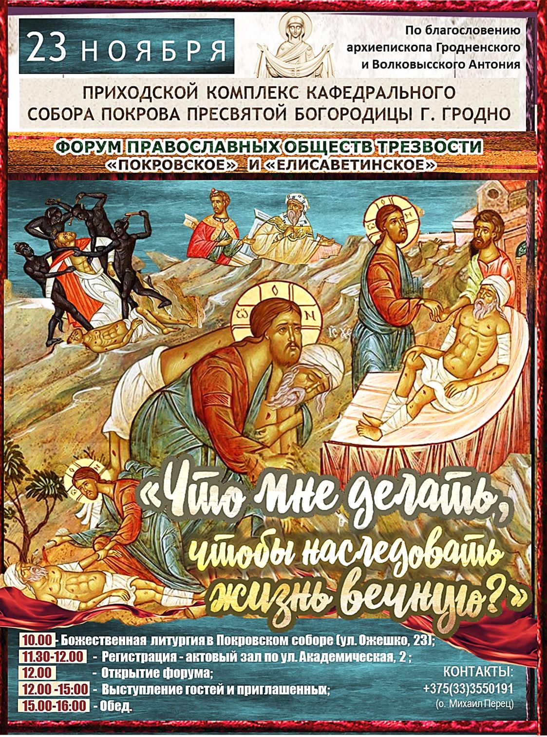 23 ноября по благословению архиепископа Гродненского и Волковысского Антония в приходском комплексе кафедрального собора Покрова Пресвятой Богородицы г.Гродно по улице Академическая, 2 состоится форум православных обществ трезвости "Покровское" и "Елисаветинское" Тема: "Что мне делать, чтобы наследовать жизнь вечную?"