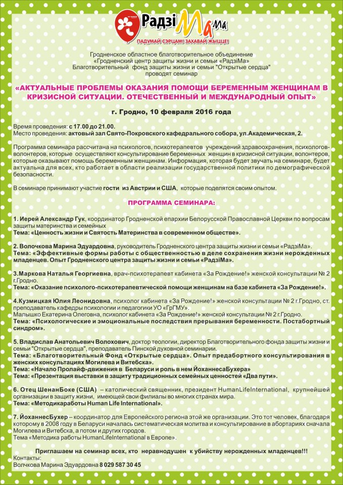 10 февраля 2016 года Гродненское областное благотворительное объединение «Гродненский центр защиты жизни и семьи «РадзiМа» и благотворительный фонд защиты жизни и семьи "Открытые сердца" организовали в актовом зале Свято-Покровского кафедрального собора семинар «Актуальные проблемы оказания помощи беременным женщинам в кризисной ситуации. Отечественный и международный опыт».