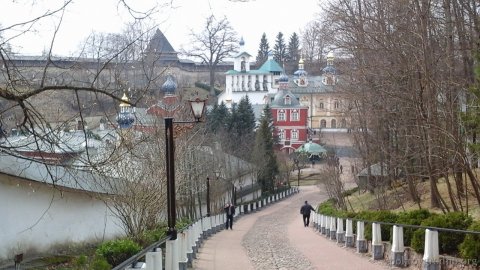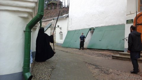 Подходя к монастырю, не видишь ни высокой колокольни, ни крестов над древней крепостной стеной - только саму стену. Сам монастырь стоит на дне глубокого оврага, и большинство его главок находятся ниже, чем основания стен.