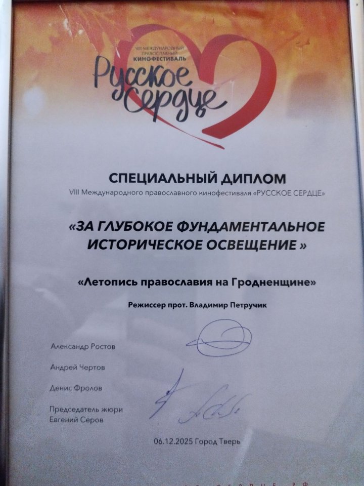 В Твери завершился VIII Международный православный кинофестиваль «Русское сердце». Среди представленных работ была и лента «Летопись Православия на Гродненщине», автором которой является клирик Покровского кафедрального собора г. Гродно протоиерей Владимир Петручик.