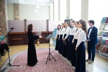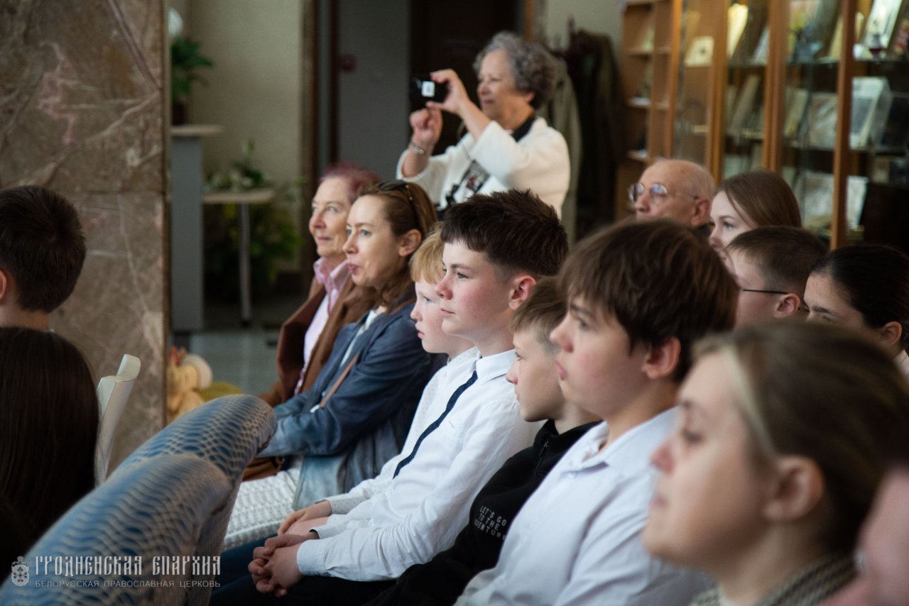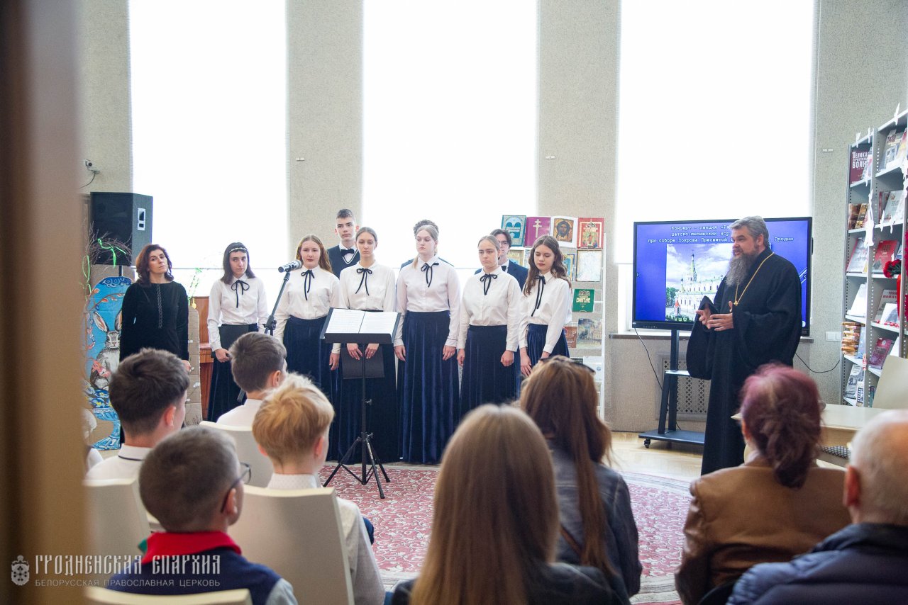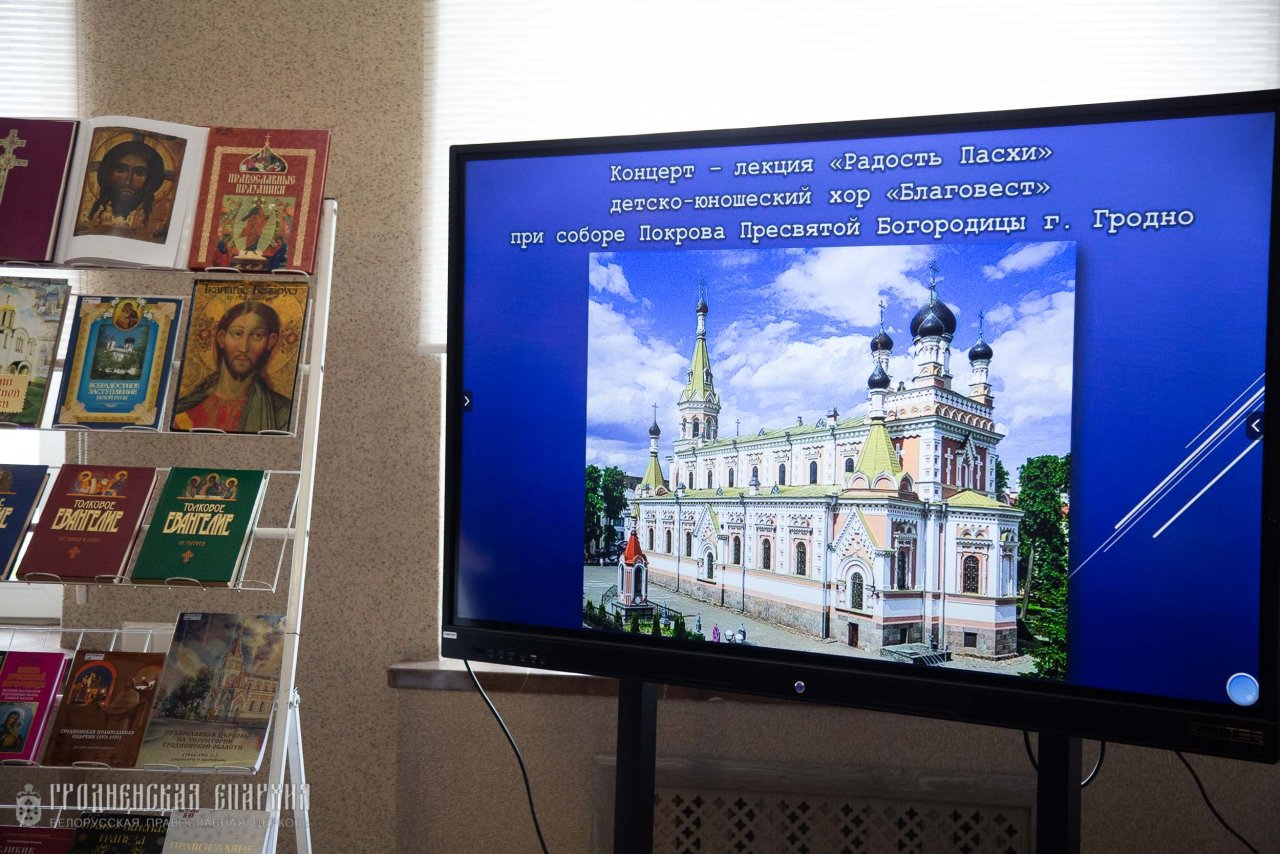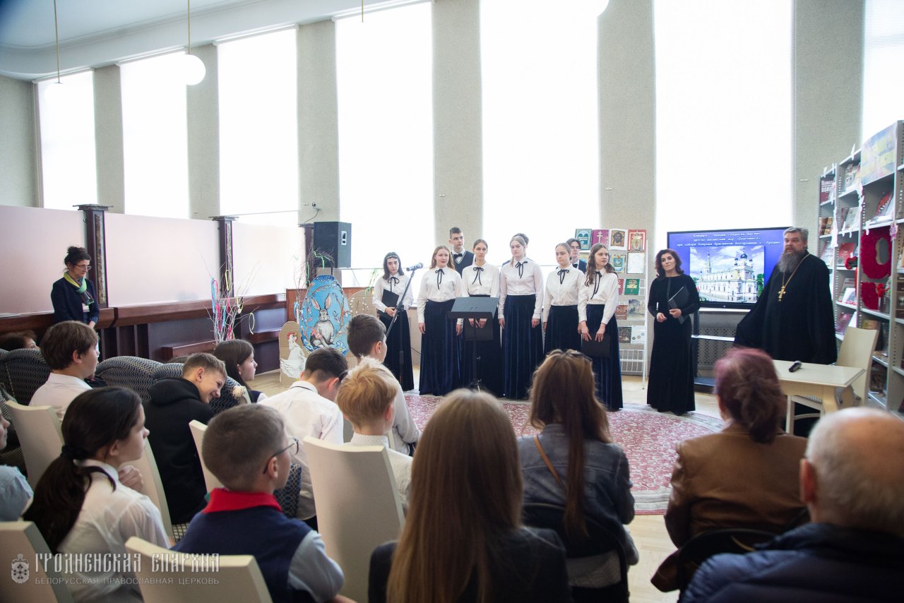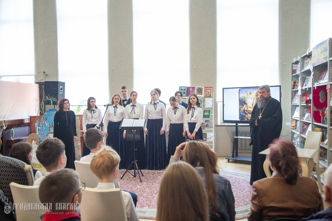 30 апреля в рамках Программы сотрудничества между Министерством культуры Республики Беларусь и Белорусской Православной Церковью настоятель Кафедрального собора Покрова Пресвятой Богородицы протоиерей Григорий Беляцкий, певчие детско-юношеского хора "Благовест" под руководством матушки Елизаветы Айкян провели концерт-лекцию "Радость Пасхи" в областной научной библиотеке имени Я. Ф. Карского.