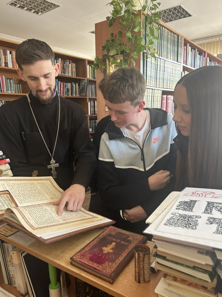 Большой интерес вызвал рассказ священника об истории книгопечатания на Руси и подвиге диакона Ивана Фёдорова, который более четырёх веков назад напечатал первую датированную книгу «Апостол», сделав слово Божие доступным для широкого круга людей.