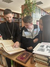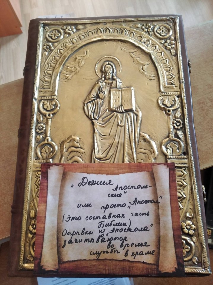 В завершение встречи школьники познакомились с особенностями церковнославянского языка и даже попробовали свои силы в чтении старинного «Апостола».
